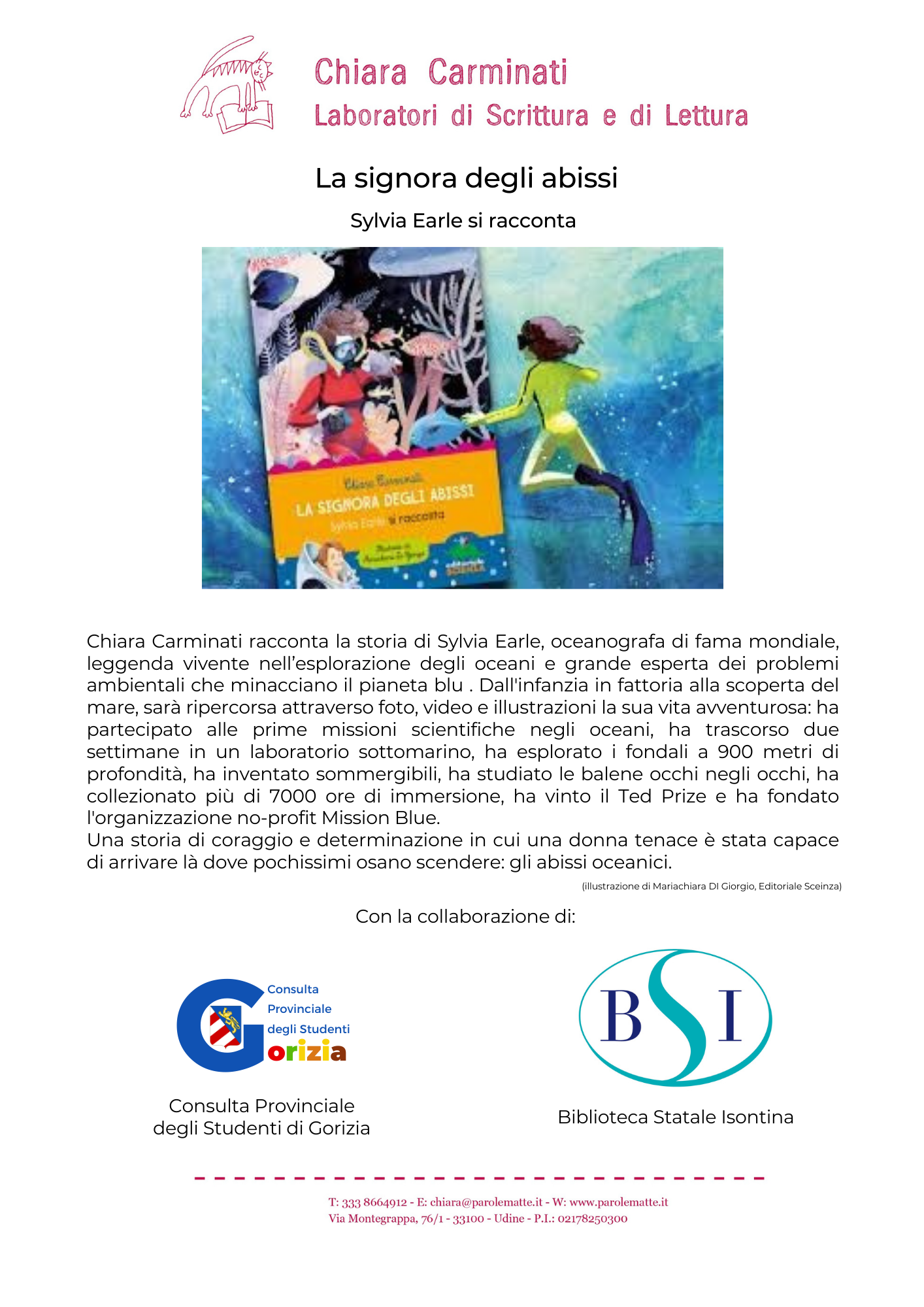 Nell'ambito del tema Donne e Scienza, proposto dalla Consulta Provinciale degli Studenti di Gorizia per il Festival èStoria, e con riferimento all'acqua, uno dei motivi sostenuti dal BidBook di Go! 2025, la referente, prof.ssa Barbara Pierotti e gli studenti della CPS di Gorizia, in collaborazione con la BSI, invitano all’'incontro con la scrittrice Chiara Carminati che presenterà il 9 maggio, alle ore 10.00, presso l’aula Magna del liceo classico Dante alighieri di Gorizia, il suo libro La signora degli abissi (Editoriale Scienza, 2017, illustrazioni di Mariachiara Di Giorgio) in cui racconta la storia della nota oceanografa Sylvia Earle.